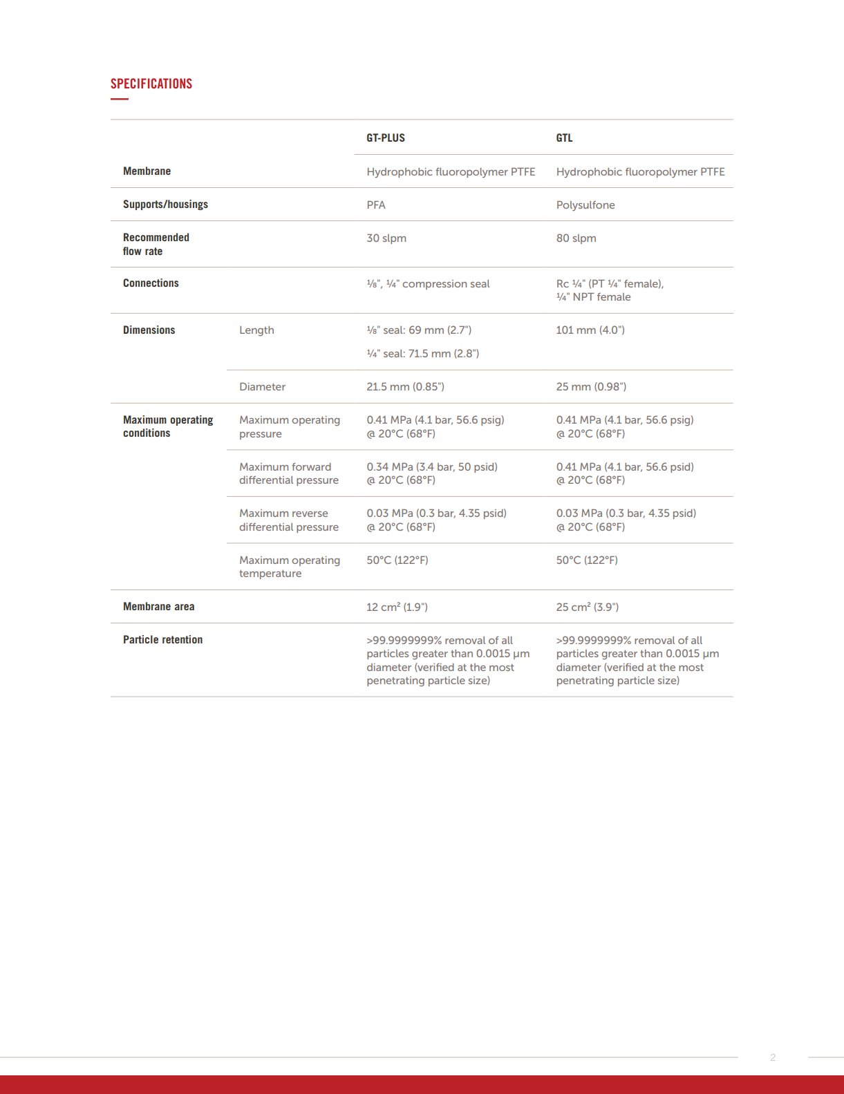 输入:PFA推荐流量30标准升每分钟连接1/8", 1/4" 压缩密封膜面积12 厘米2 (1.9 英寸2)颗粒保留>99.9999999%去除所有直径大于0.0015微米的颗粒(在最穿透粒子尺寸下验证)操作条件最大工作压力: